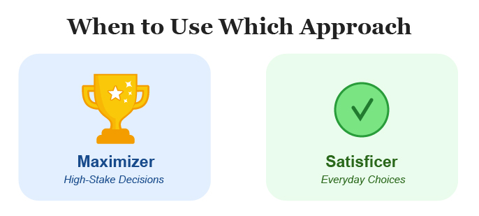 - Satisficers settle for “good enough” to move forward, ideal for routine choices.